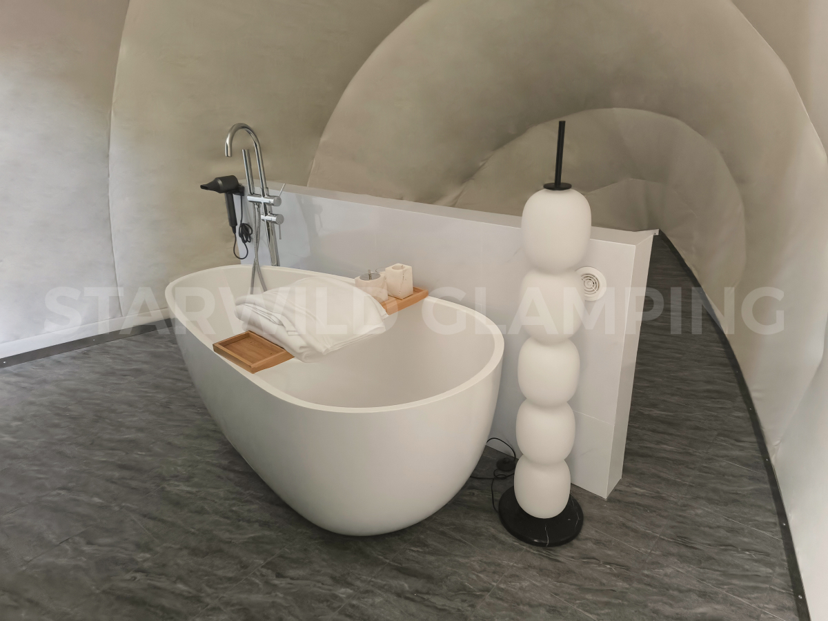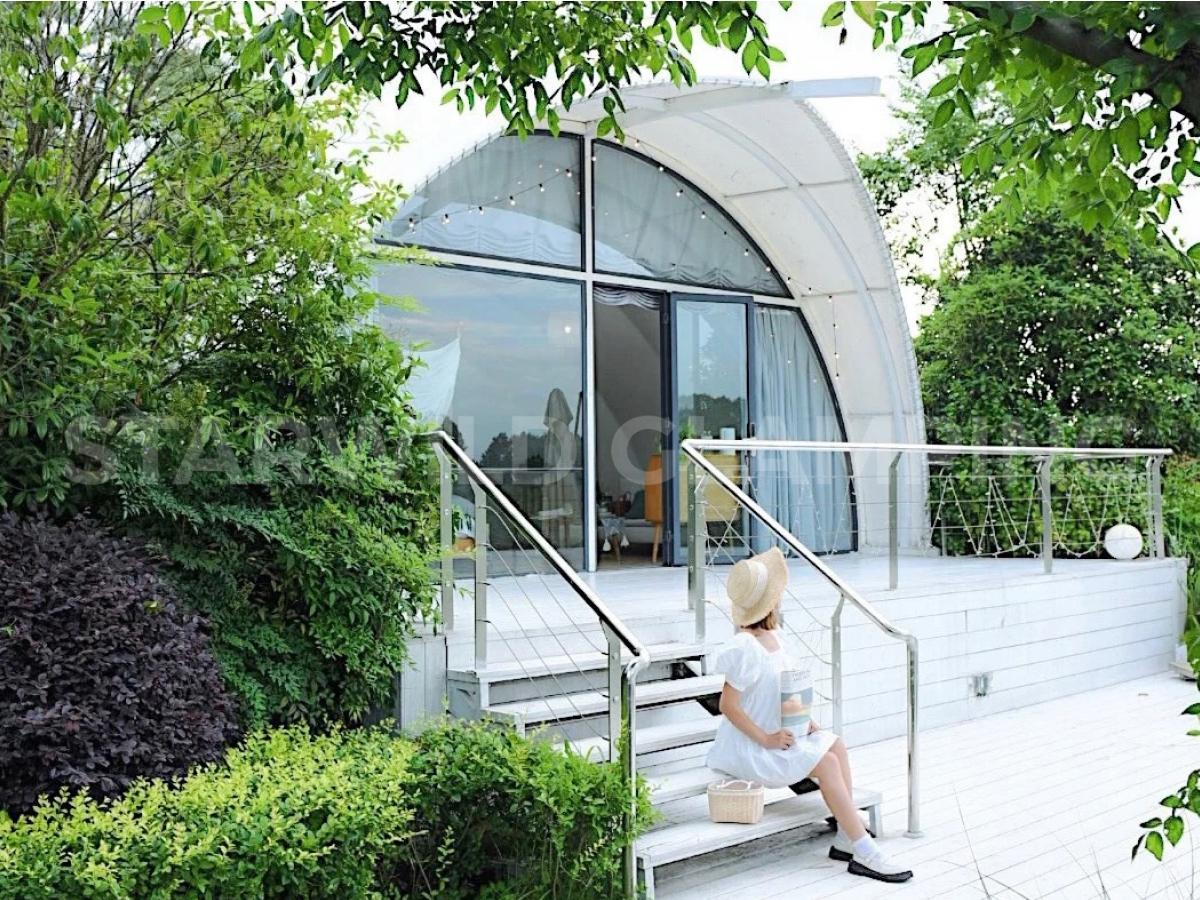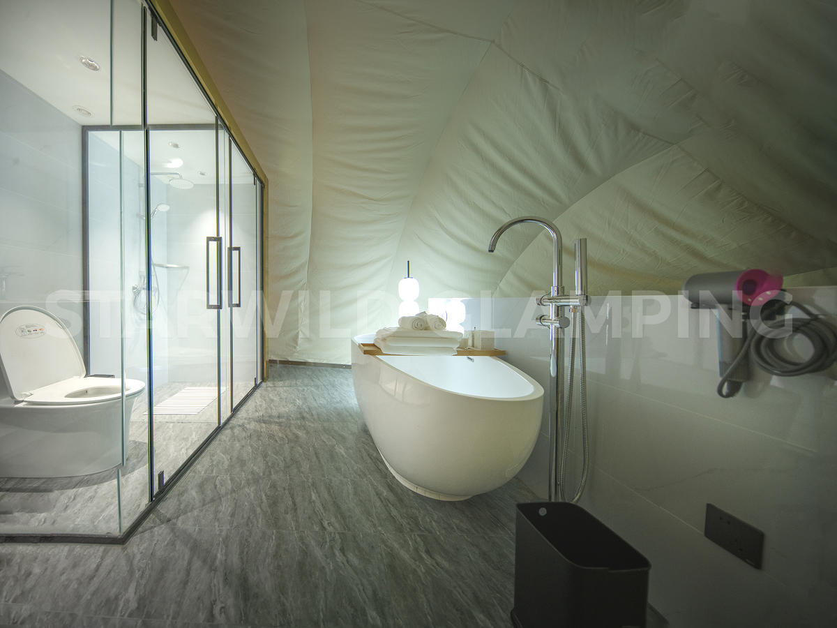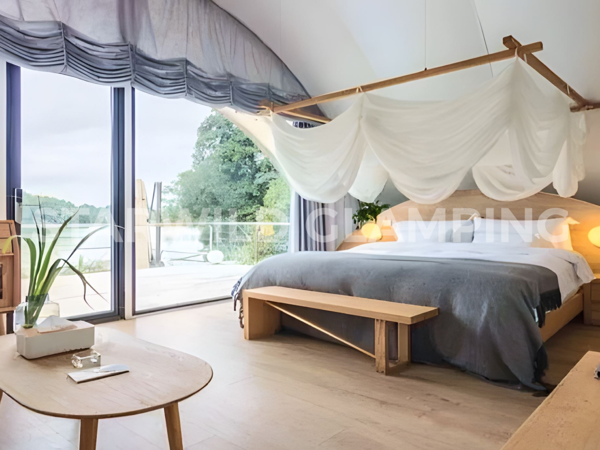 The Aquarius Type Luxury Glamping Tent is built with a sturdy and durable structure. It features a galvanized steel frame with a special outdoor coating, ensuring strength and resistance to harsh weather conditions.