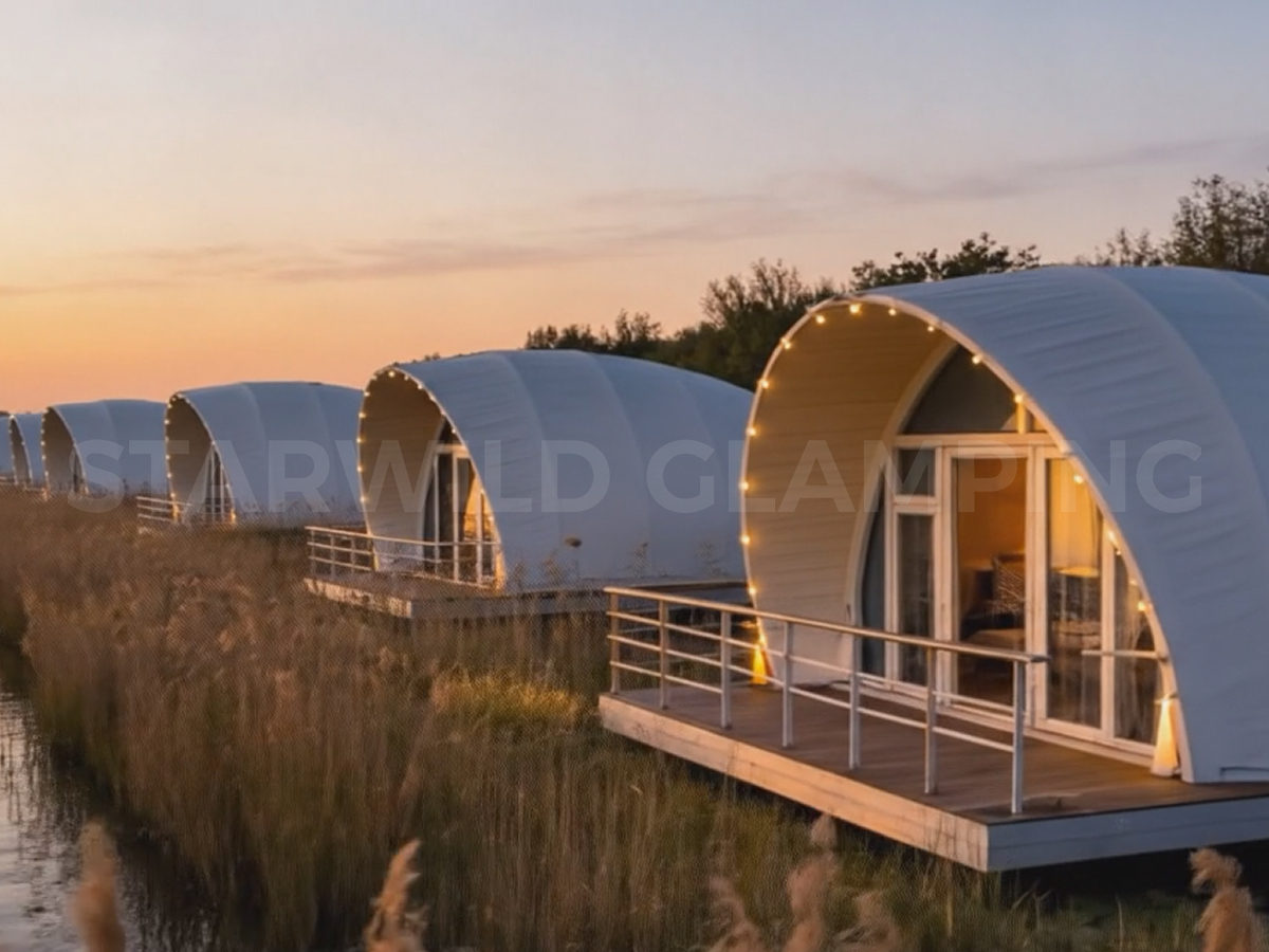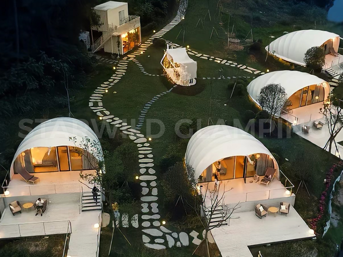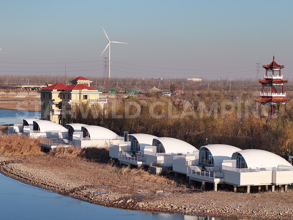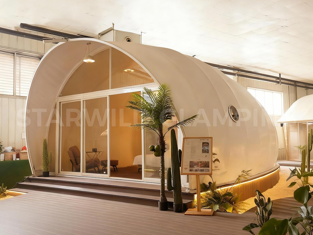The Aquarius Type Luxury Glamping Tent is built with a sturdy and durable structure. It features a galvanized steel frame with a special outdoor coating, ensuring strength and resistance to harsh weather conditions.