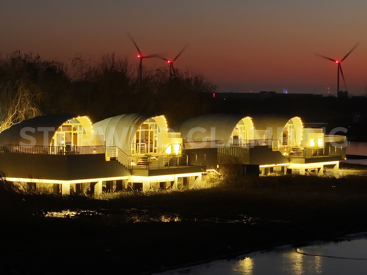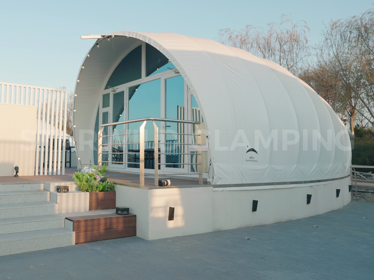 The roof of the Aquarius Type luxury hotel tent is made from a high-quality and wear-resistant PVC fabric. This roof cover is fire-resistant, water-resistant, and UV-resistant, providing protection from the elements. It is easy to maintain and ensures durability and longevity.