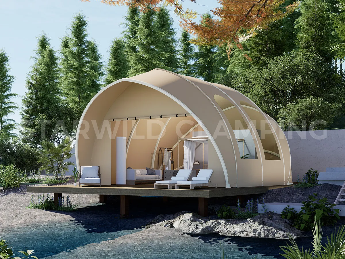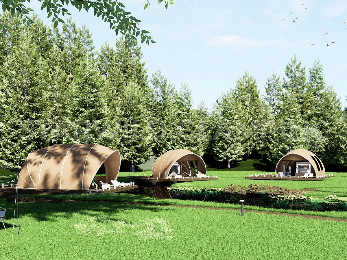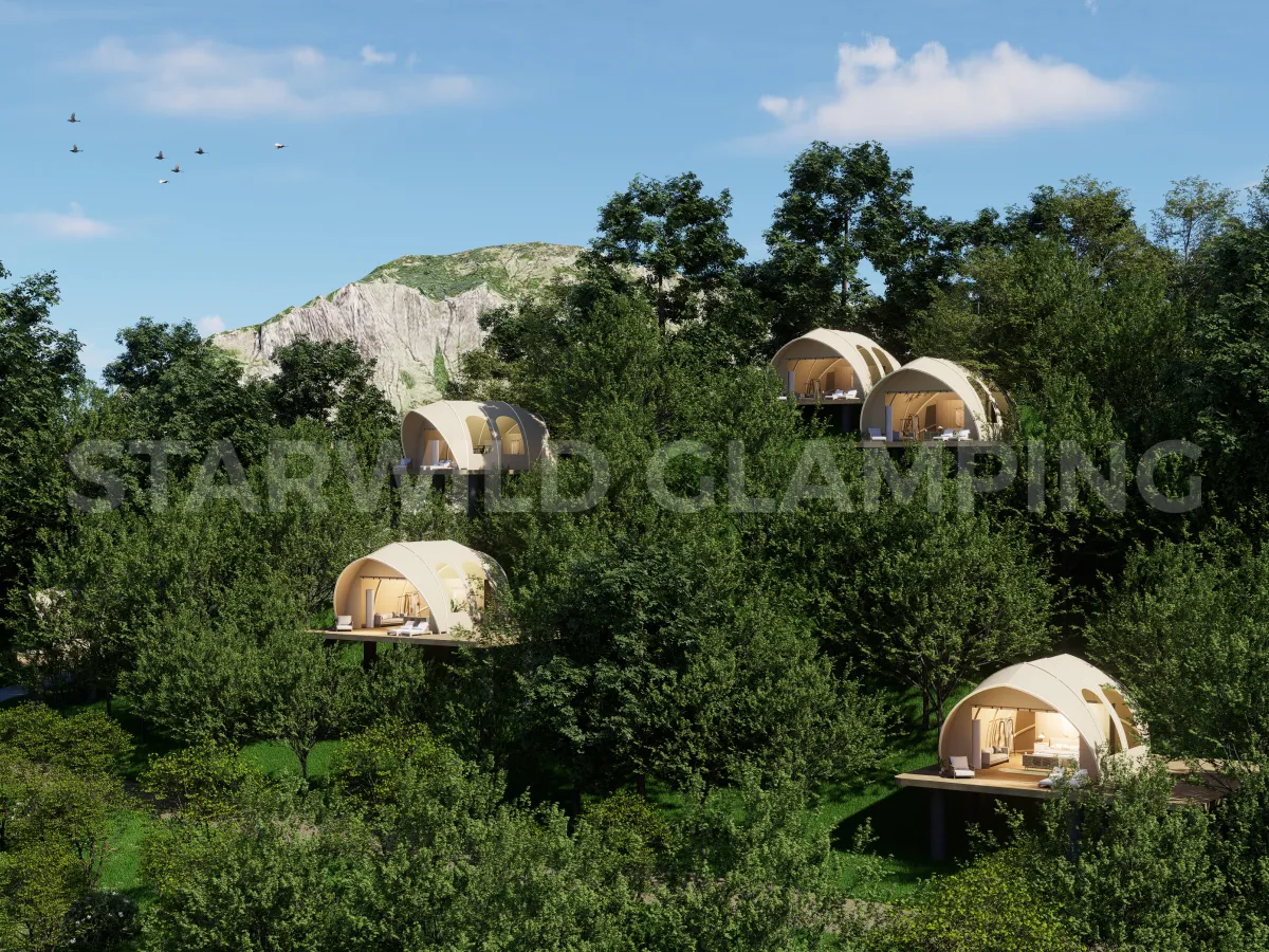 The Ara Luxury Glamping Tent is one of our largest luxury tents and truly gives campers a sense of freedom and holiday in the middle of nature. This is especially due to the tent’s unique use of space: the wide entrance, large windows and 4.1-metre high ridge give guests that true camping feeling, but with the desired convenience and comfort, such as a high-quality bed, toilet, shower and kitchen.