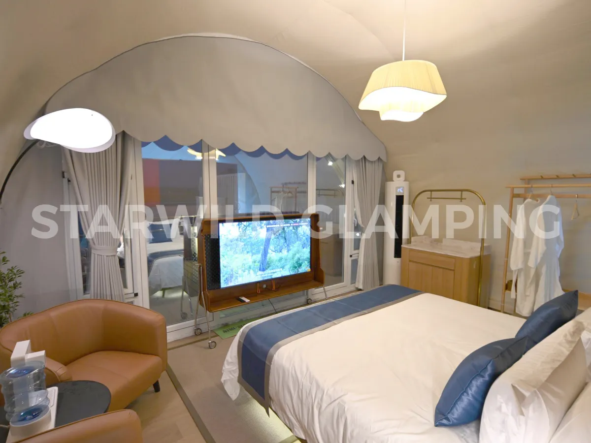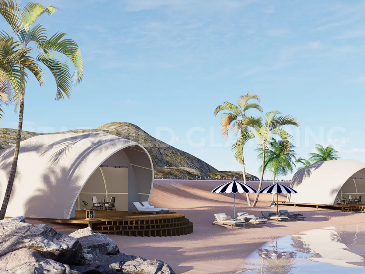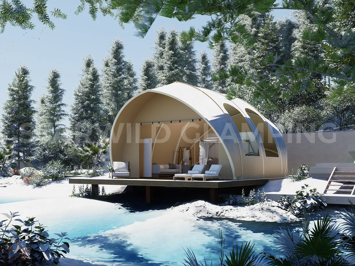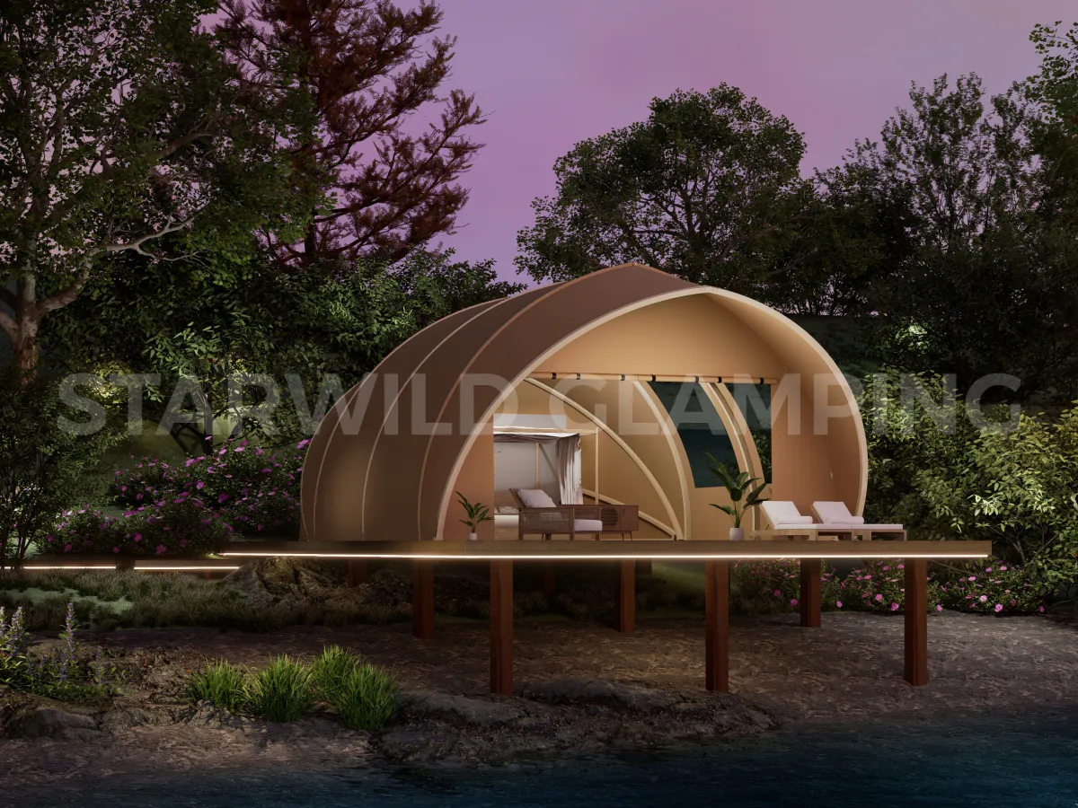 The Ara Luxury Glamping Tent is one of our largest luxury tents and truly gives campers a sense of freedom and holiday in the middle of nature. This is especially due to the tent’s unique use of space: the wide entrance, large windows and 4.1-metre high ridge give guests that true camping feeling, but with the desired convenience and comfort, such as a high-quality bed, toilet, shower and kitchen.