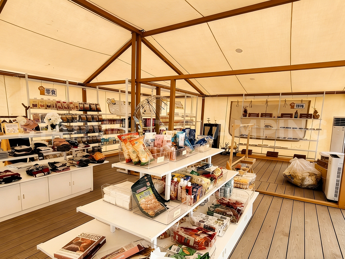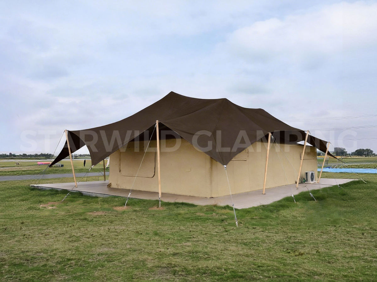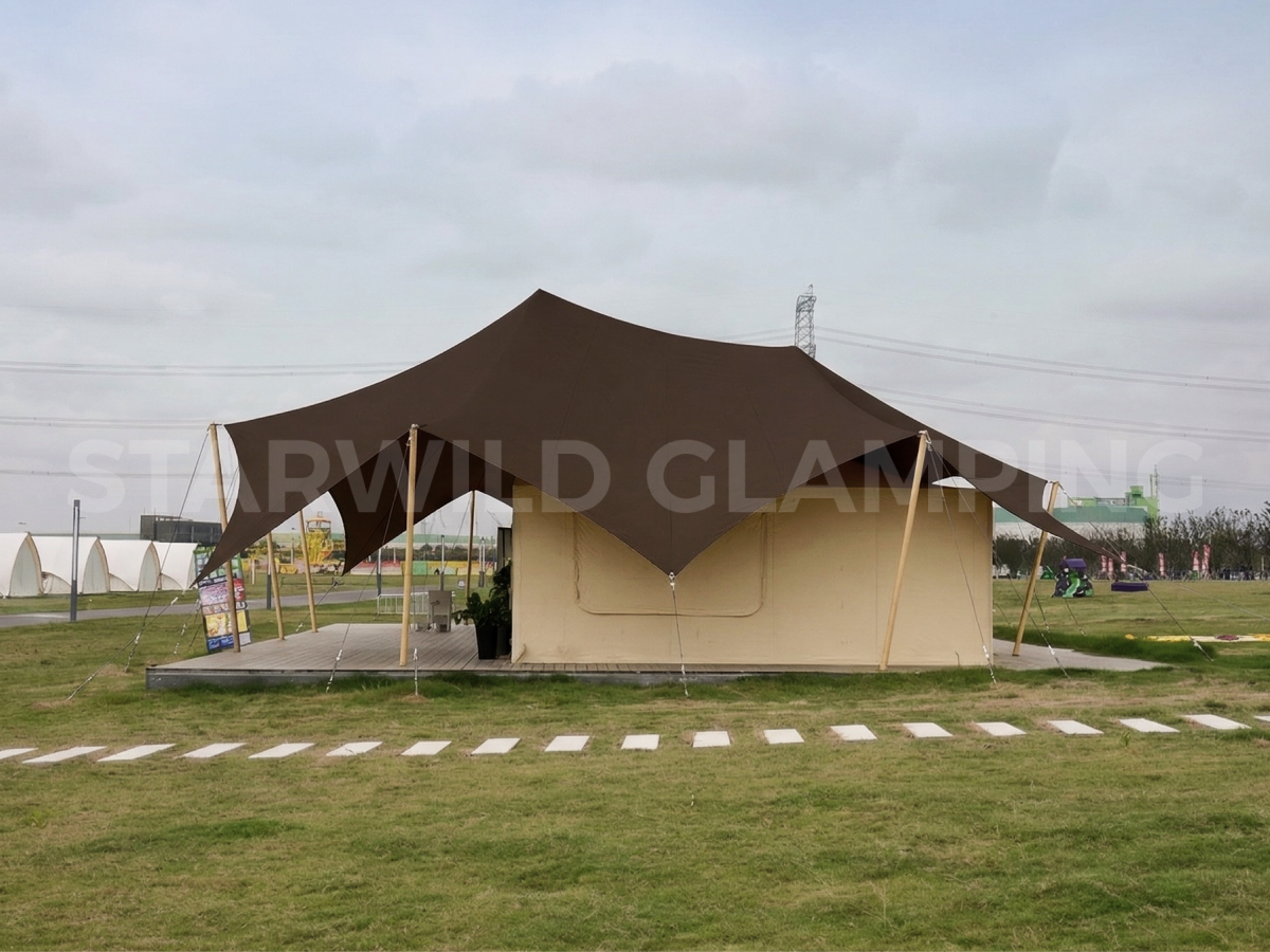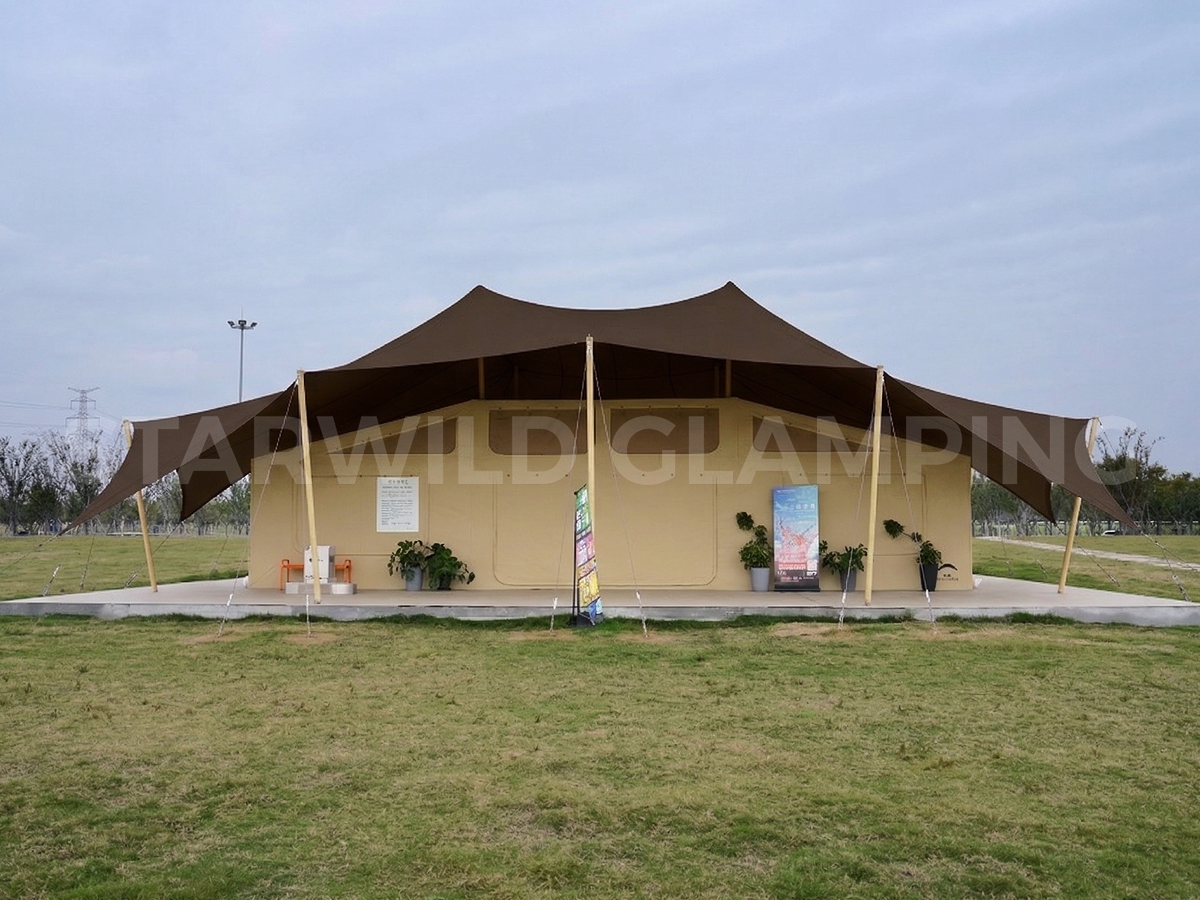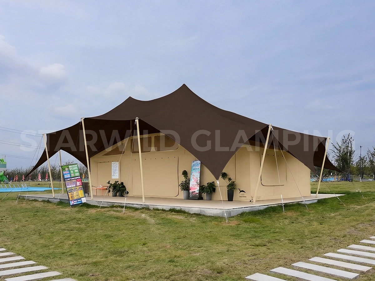 The Pavo A87 Glamping Stretch Tent is designed for resort and glamping project professionals who need larger, multi-functional spaces with reliable performance. Combining an eco-friendly TC cotton cabin with a double stretch roof system, it reduces heat buildup while maintaining airflow—ideal for desert camps and open environments.