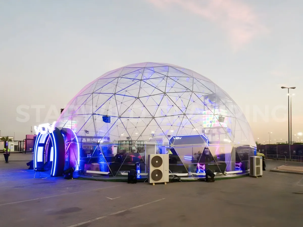 The Taurus type transparent geodesic dome tent is built with a sturdy and durable structure. It features a steel frame with a special outdoor coating, ensuring strength and resistance to harsh weather conditions.