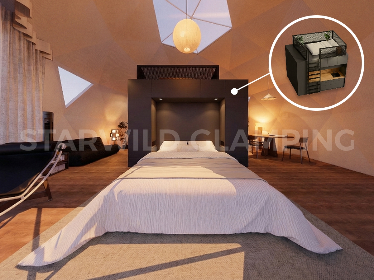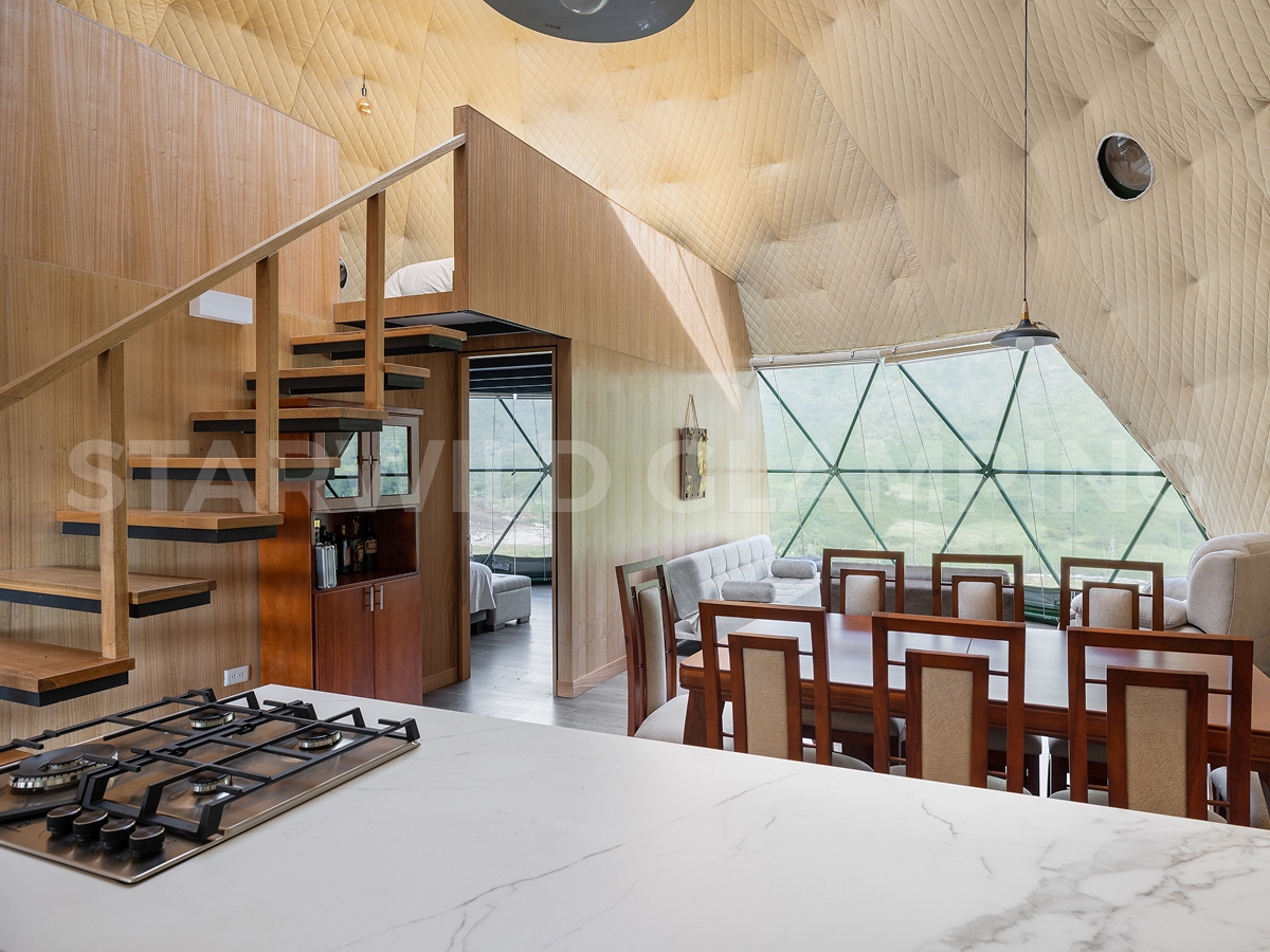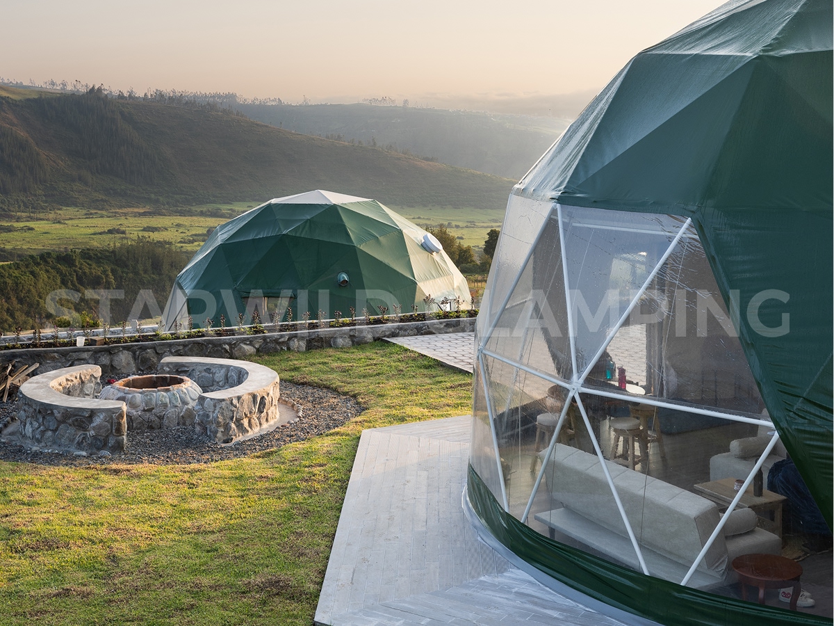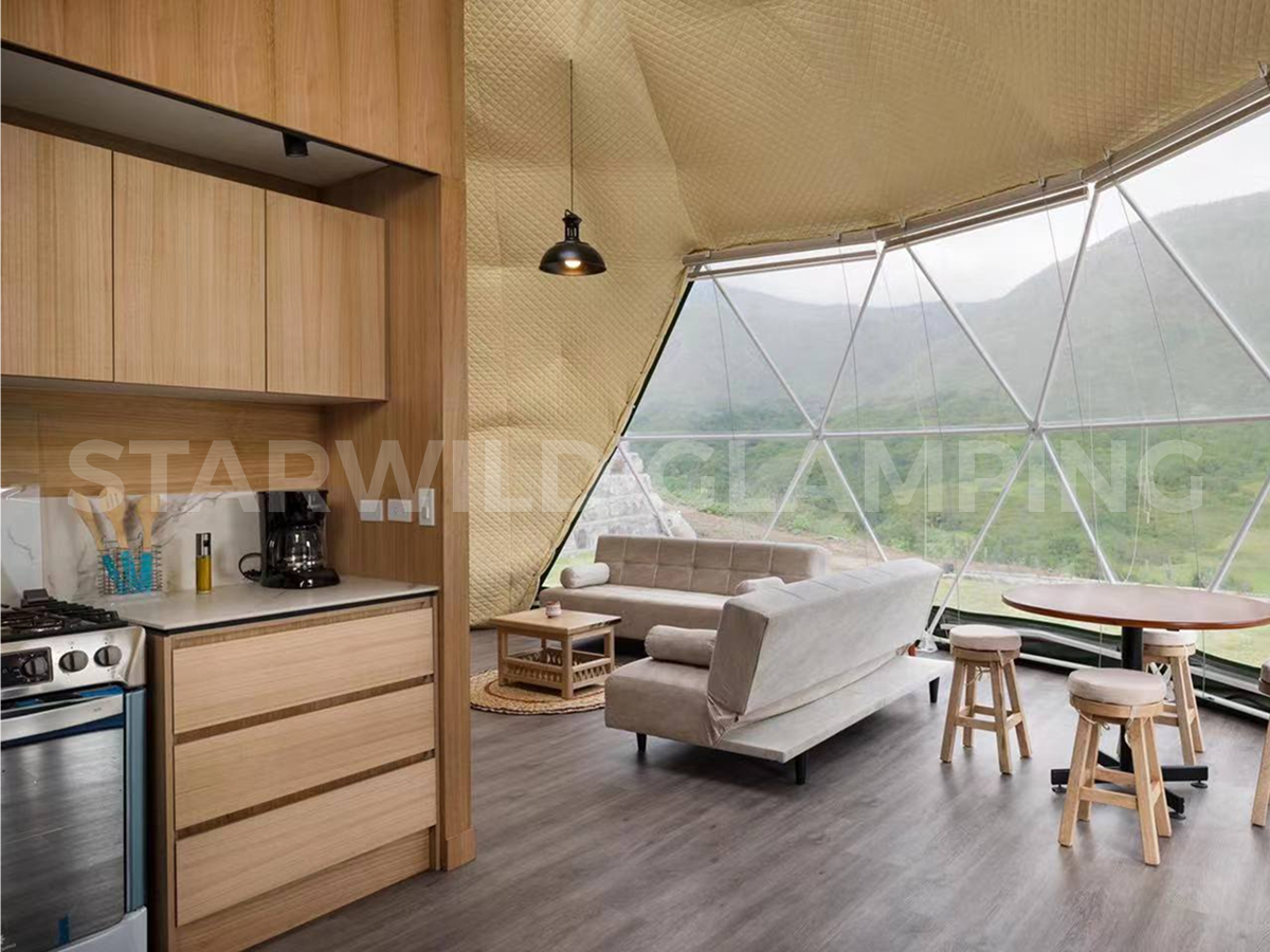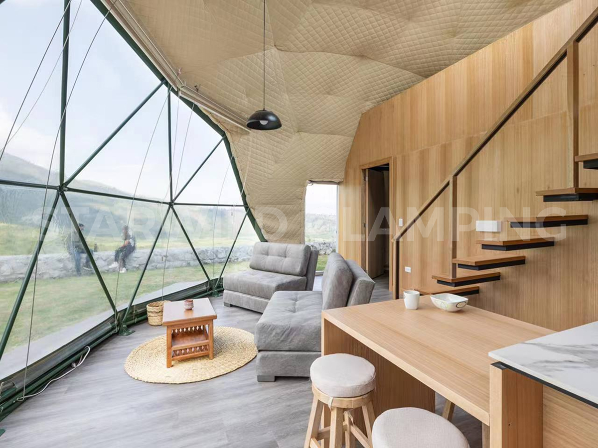 The Sirius is a luxurious glamping dome tent designed for comfort and convenience. Geo dome tent glamping features a sturdy structure and a spacious interior, making it ideal for family camping trips. Our Starwild extensive collection of glamping dome tents for sale offers a range of sizes and customization options for your needs.